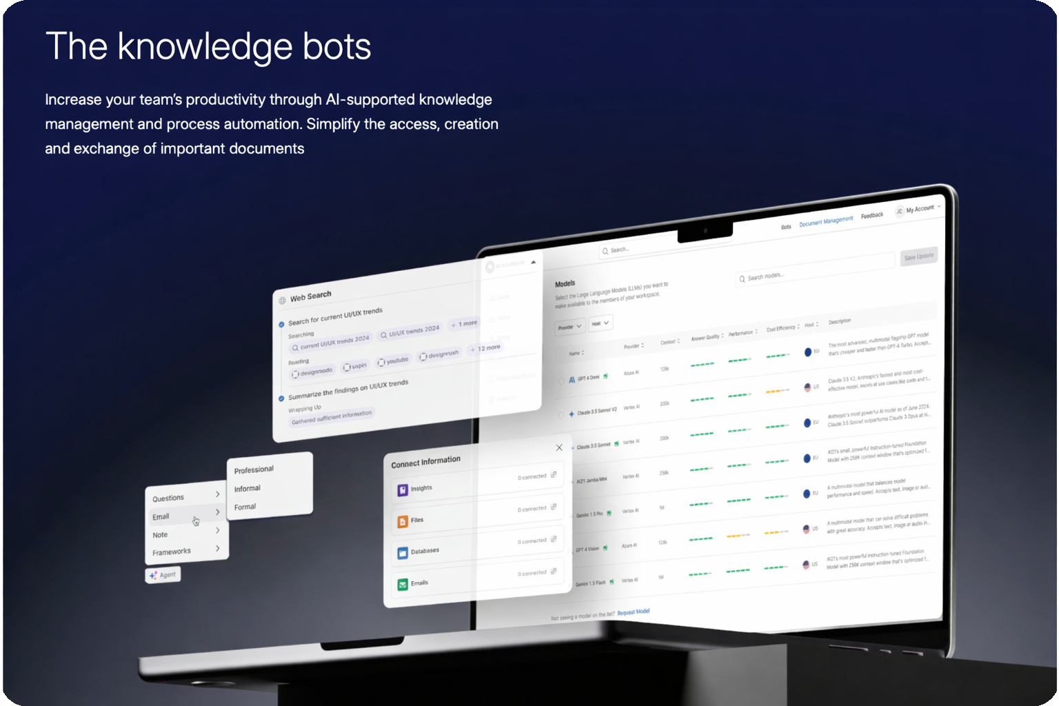 Blockbrain provides a high-quality AI construction kit to automate processes, improve efficiency, and enable secure access to knowledge anytime. Use your own data hosted in a German/European cloud. Start small, scale fast — via platform or API.